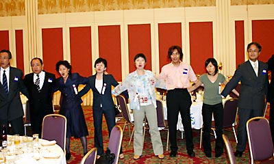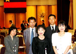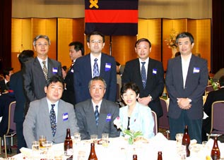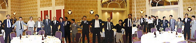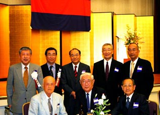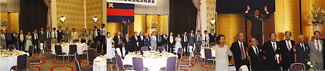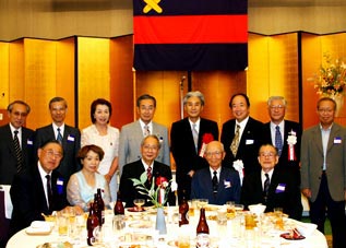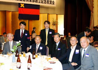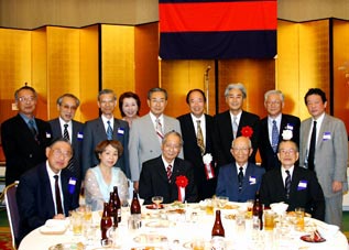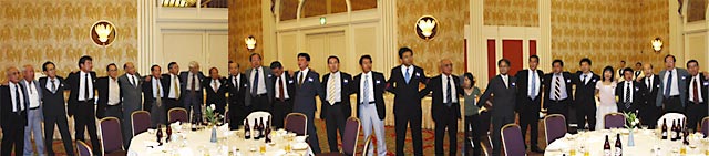 田嶋副会長の謝辞で記念式典が終了した後、牧野相談役の乾杯で懇親会が始まりました。途中、平成卒の若手と塩川先輩を囲み、一同記念撮影。 最後には参加者一同肩を組み恒例の「若き血」を大合唱。なごやかな雰囲気の中、会は終了しました。