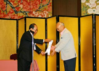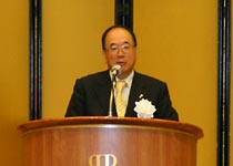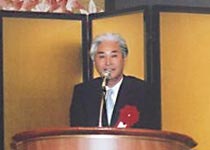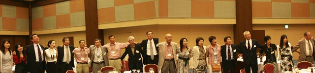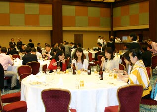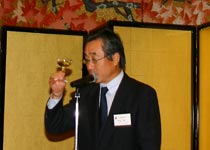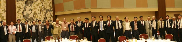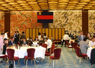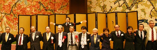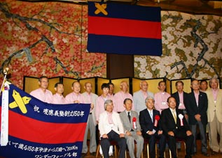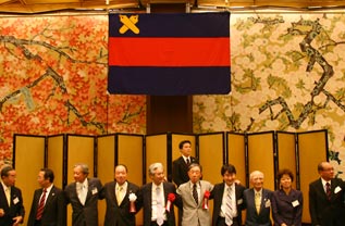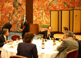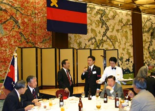 森常任理事のご挨拶があり、慶應義塾創立150年記念行事の一つであるワンダーフォーゲル部「歩いて識る150年“中津から三田へ1500km”」の中津から三田へのワンデルング途中のワンダーフォーゲル部三田会の皆様をお迎えし、交歓会が行われ記念式典が終了、田尻副会長の乾杯で懇親会が始まりました。