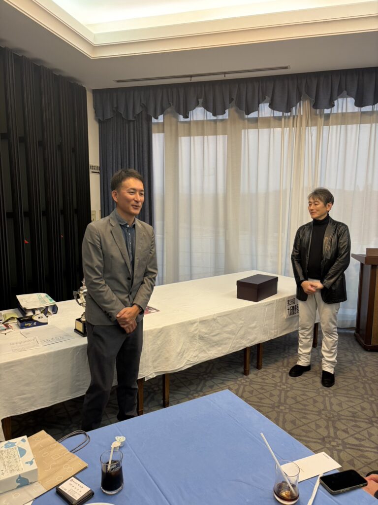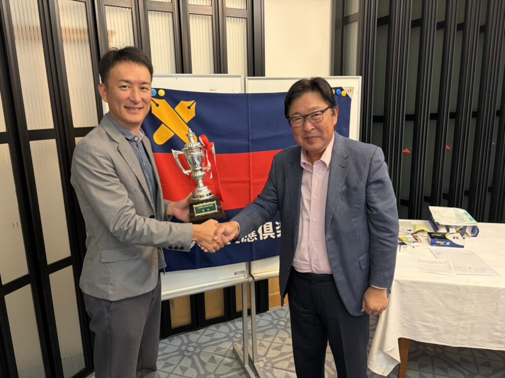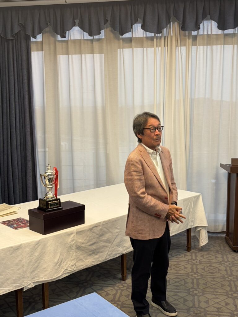 プレー後の表彰式に先立ち、名刺交換や挨拶を通じて親交を深める時間が設けられ、和やかな雰囲気の中で交流が広がりました。表彰式では、渡辺会長より会長杯の授与と祝辞をいただき、さらに金井先輩からは「来年の関西ゴルフの見どころ」についてお話しいただきました。